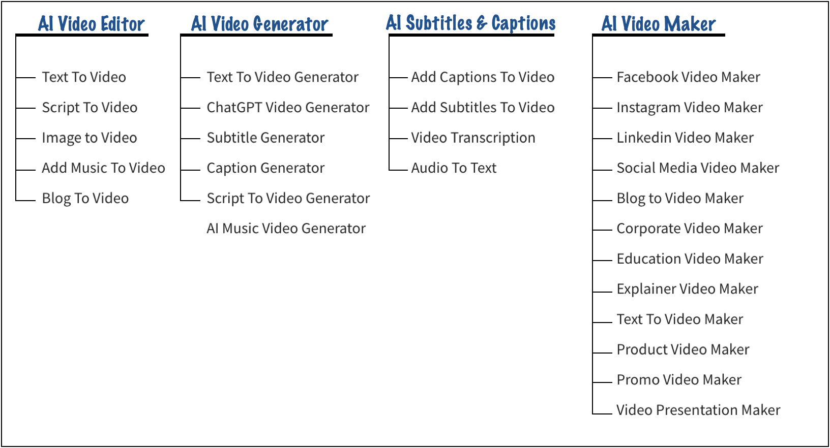 AI Video tools—include AI wizards that create scripts with GPT-4 integrations, helping transform ideas into full videos with a single text prompt.