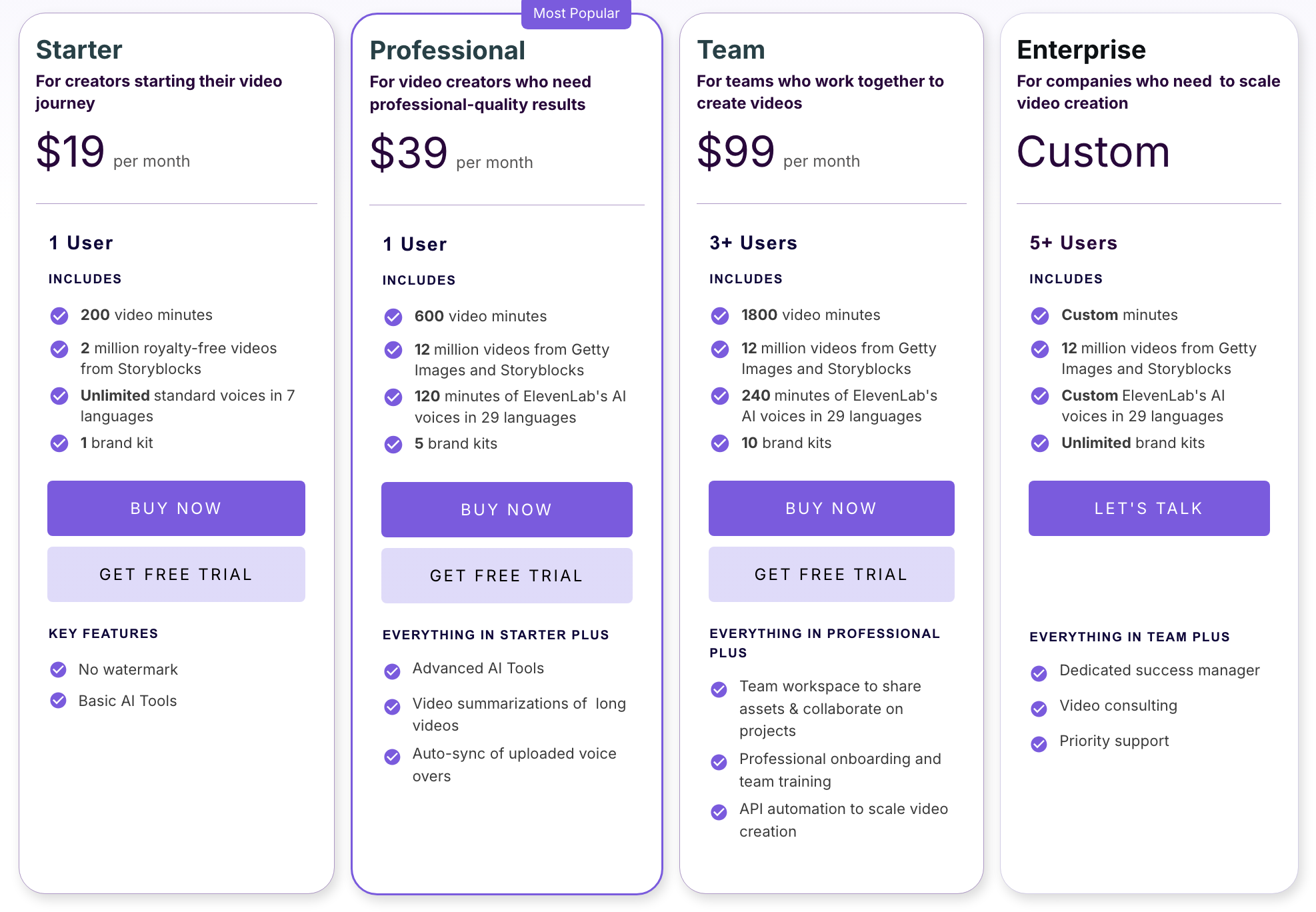 A free trial lets you test Pictory without requiring payment details. You can create 3 video projects, each up to 10 minutes long. The relatively basic starter package costs just $19 per month, rising to $39 for the Professional plan and $99 per month for teams. For publishers looking to scale, an enterprise plan is available upon inquiry.