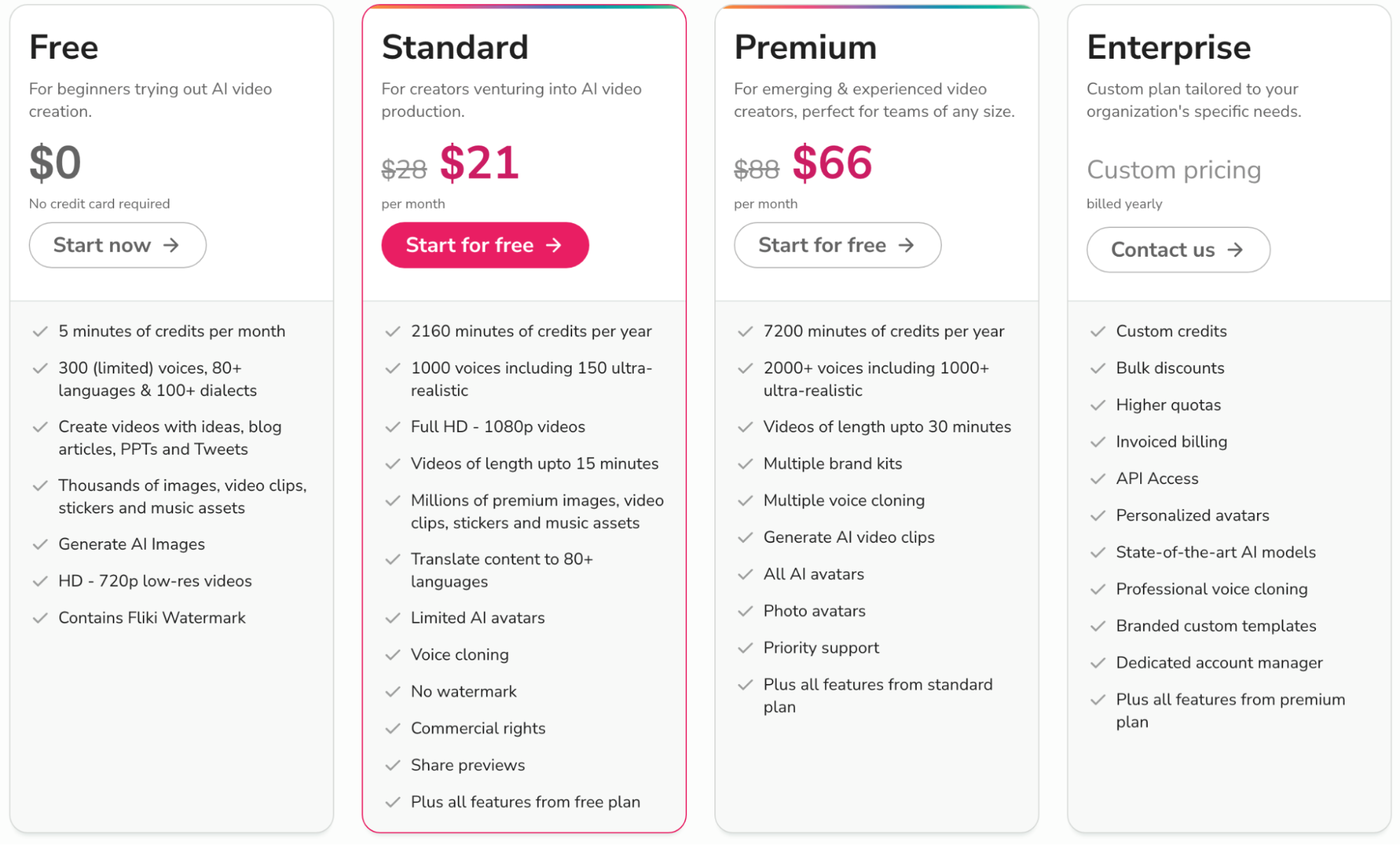 Fliki’s is free to test with a 5-minute limit. The premium plan ($66 monthly) provides 7200 minutes of yearly credit, with quality restricted to 1080p. Publishers looking to scale can contact sales for an enterprise plan.