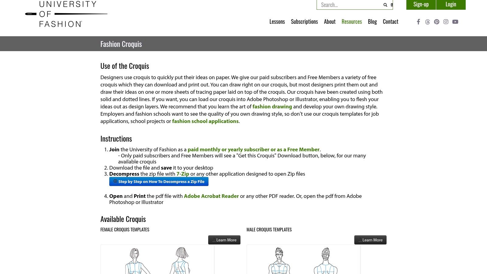 The University of Fashion offers a unique entry point for artists looking for a clothes drawing reference rooted in industry-standard design practices. While not a photo library, its collection of croquis templates provides the foundational figure poses used by professional fashion designers. This resource is perfect for artists who want to move beyond simple figure drawing and start designing clothing with proper proportions and presentation in mind. The platform provides downloadable figures for female, male, plus-size, and child models.