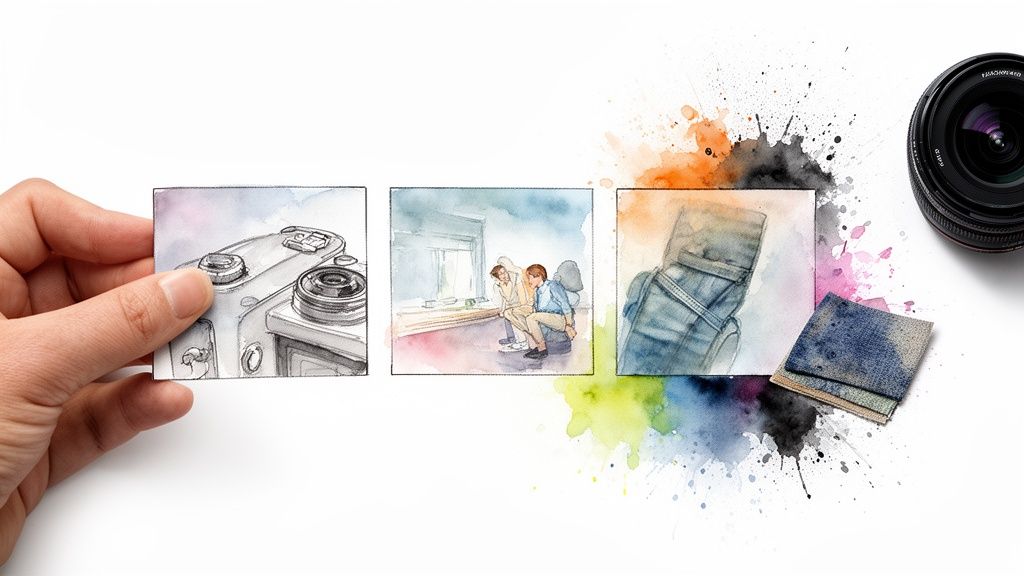 With your assets in hand, you can start sketching out simple but effective storyboards. Think of them as mini-narratives that guide the video's flow. A "New Arrivals" video, for instance, could open with a wide lifestyle shot, cut to close-ups of key pieces, and wrap up with a strong call-to-action. Or maybe a "Behind the Seams" featurette, combining shots of raw materials with detailed product images and text overlays about the craftsmanship.